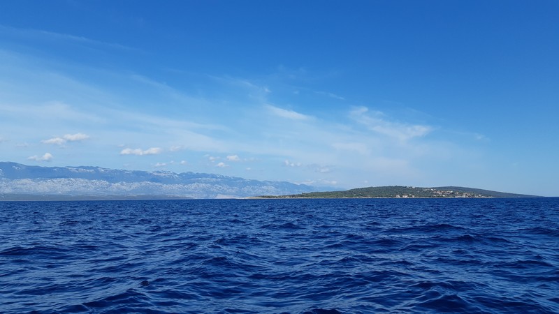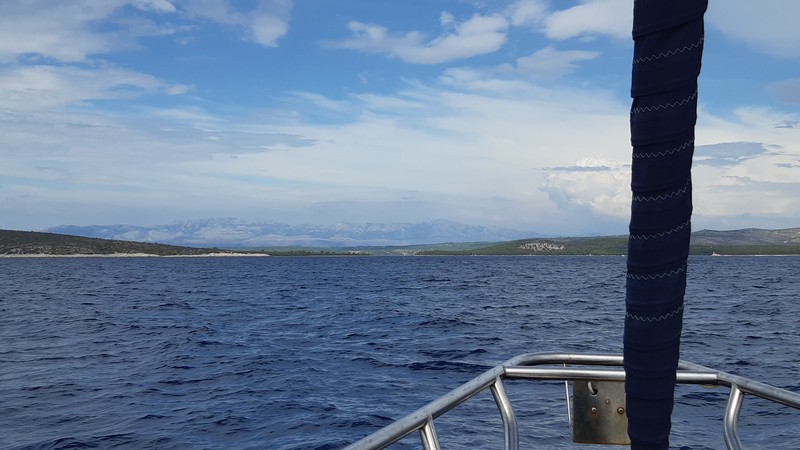 Encore une très belle journée de navigation : la quatrième journée d’affilée avec un vent porteur, ce qui est très rare en août dans ce sens de circulation. Une mer un peu agitée, de la houle… juste ce qu’il faut d’action ! Un paysage de classe exceptionnelle : l’île de Pag au premier plan et les montagnes du Velebit en arrière-plan. Barrer ici est un régal ! Mais faire la cuisine lorsque le bateau gite… un peu moins !
