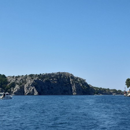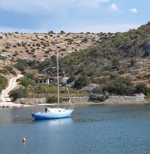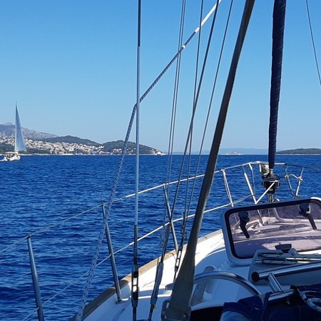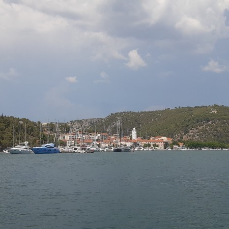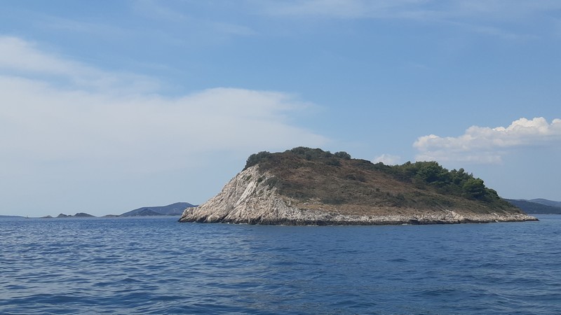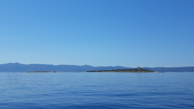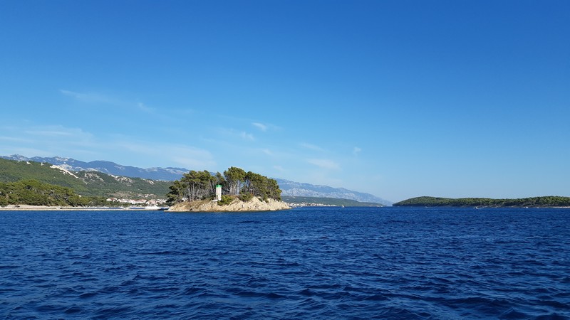 Aujourd’hui, nous quittons la baie de Trogir au moteur. Les deux nouveaux équipiers s’y connaissent bien en matière de voile et rendent les manœuvres agréables. De plus, ils ont beaucoup voyagé et c’est un vrai plaisir de les écouter raconter leur vie passée en Guadeloupe, la transpacifique à la voile de leur fille… (là, je suis toute ouïe !)