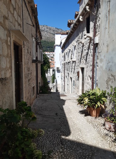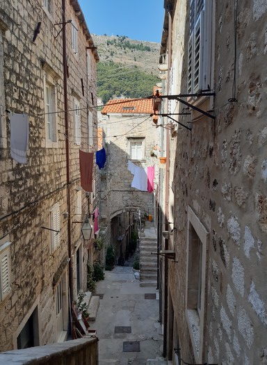 Je goûte l’atmosphère de cette ville qui, à l’image de Vérone, Padoue ou encore Ferrare, a su garder son âme et ne s’est pas transformée en ville-musée. En quittant les axes principaux et notamment le Stradun (rue principale), je découvre une ville tranquille qui semble vivre au rythme paisible de ses habitants. Ceux-ci discutent entre eux sur le seuil de leurs maisons ou dans les courettes. Au détour d’un escalier pittoresque, les cordes à linge et les pots de fleurs éclairent les ruelles pavées.