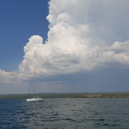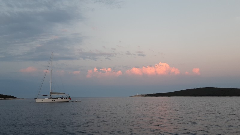 Après un passage par la capitainerie, nous quittons enfin l’île de Vis vers onze heures. La météo reste difficile : nous louvoyons entre deux grains (orages). Les éclairs à l’horizon, devant et derrière nous, sont très impressionnants. Je m’amuse bien à l’avant du bateau : le creux des vagues fait ressentir des sensations plus fortes que les montagnes russes !
