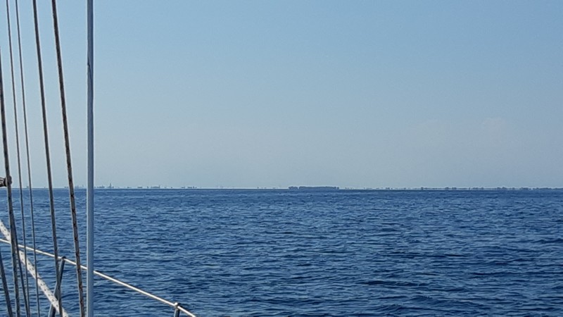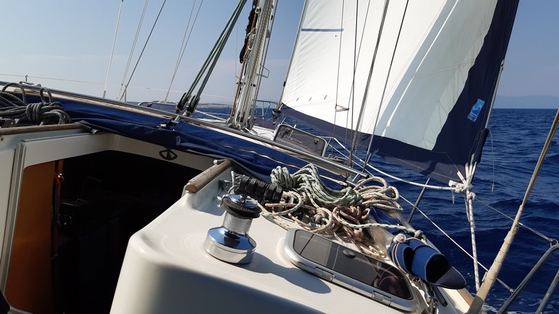 Ce matin, il n’y a pas un souffle de vent : en langage marin, c’est ce qu’on appelle une « pétole ». Ayant envoyé le génois (la voile avant), nous coupons le moteur en espérant naviguer un peu à la voile, mais nous faisons rapidement du sur-place sur une mer d’huile. Quand je pense que par le passé, les voiliers n’avaient pas de moteur… Lorsqu’ils faisaient du sur-place, les marins attendaient que le vent se levât : quelques heures, quelques jours, voire plus. Heureusement, les voiliers modernes ont un moteur !