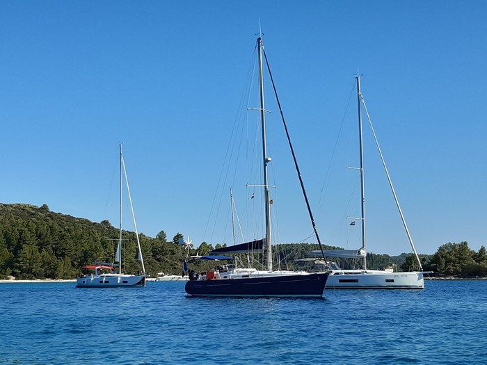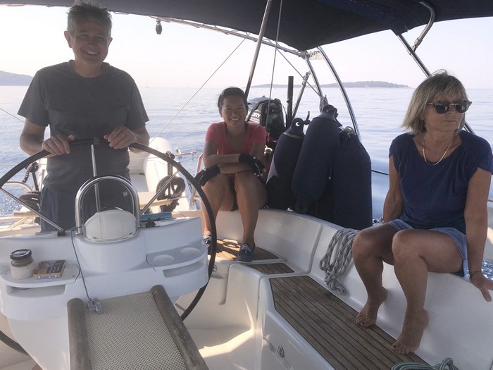 Les vents croates sont d’une ponctualité remarquable. La brise se lève à midi et souffle jusqu’en fin d’après-midi. Comme nous prenons la mer tôt le matin, nous n’avons que peu de vent. Espérons qu’il y en aura davantage par la suite ! Cela facilite mon apprentissage de certaines manœuvres quotidiennes : amarrer le bateau, envoyer et enrouler le génois, envoyer et affaler la grand voile. En revanche, je n’ai pas encore appris à virer de bord puisqu’il n’y a pas de vent. Et j’ai envie d’apprendre à barrer (tenir le gouvernail) !