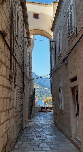 Korčula est une splendide ville médiévale dont chaque ruelle enchante le visiteur. Le sommet du clocher de l’église offre une vue panoramique sur les îles environnantes, y compris celles fermant le golfe qui mène en Bosnie. Le mélange de végétation luxuriante et de montagne dénudée, bordée d’une mer d’un bleu profond, les odeurs de pin parasol et d’iode, le chant de cigales, le clapotis de l’eau… un véritable envoûtement pour les sens !