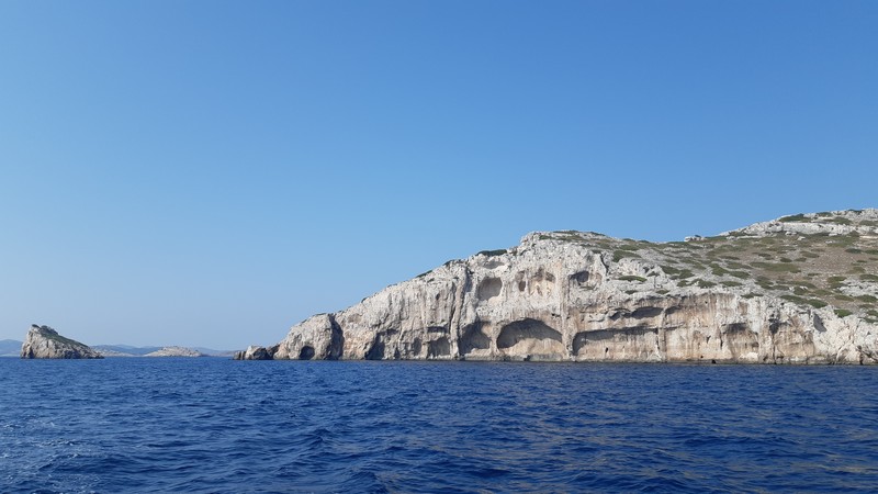 C’est la plus belle navigation de toute ma traversée de l’Adriatique. Je suis fascinée par les formations géologiques des Kornati : mes yeux voient de grandes dunes désertiques comme il en existe en Jordanie… mais posées sur l’eau, le tout dans des teintes crème et bleu pastel ! Mais aussi des falaises à couper le souffle !