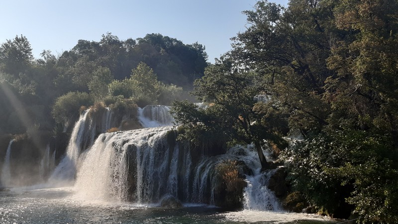 Tandis que les autres équipiers attendent la navette fluviale, je me rends à pied aux chutes d’eau de Skradinski Buk, célèbre carte postale croate. Ces chutes d’eau spectaculaires sont les plus grandes chutes karstiques d’Europe.