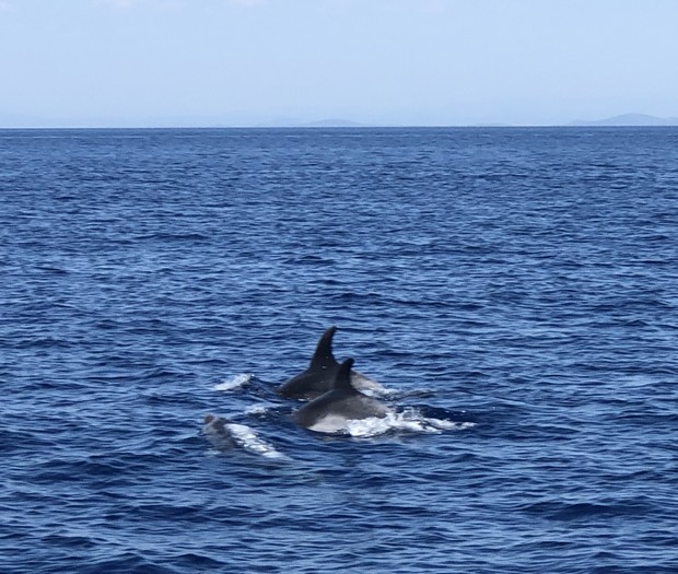 … Finalement, vers onze heures le vent se lève, doux et porteur, ce qui nous permet de naviguer à la voile sur l’ensemble du trajet ! Une navigation très agréable. Pour couronner le tout, des dauphins viennent nous rendre visite à l’heure du déjeuner ! Le groupe de dauphins poursuit un chalutier qui se trouve non loin de nous, et trois d’entre eux viennent nager sous la coque de Sterenn pendant quelques minutes. Ils sont si près de nous que nous pouvons presque les toucher !