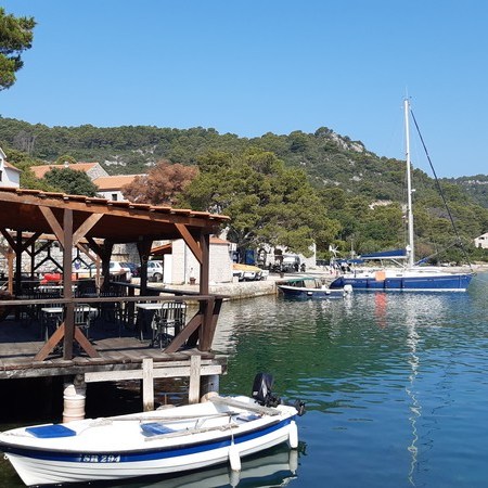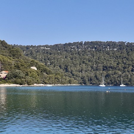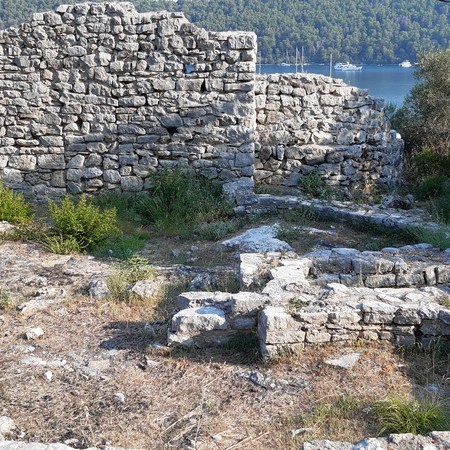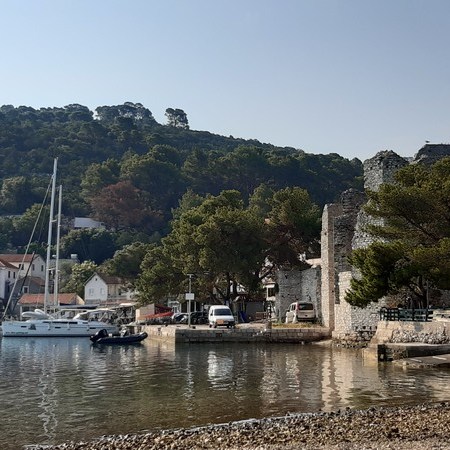 Nous arrivons vers treize heures au joli mouillage de Polače, un petit village de l’île de Mljet situé dans une anse naturellement protégée par de petits îlots. Un palais romain (en ruines) ainsi que deux basiliques primitives (en ruines également) jouxtent le port.