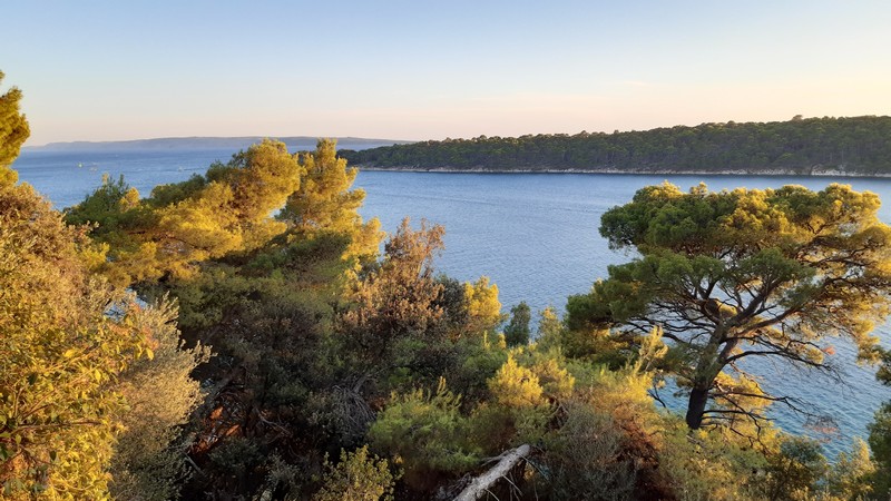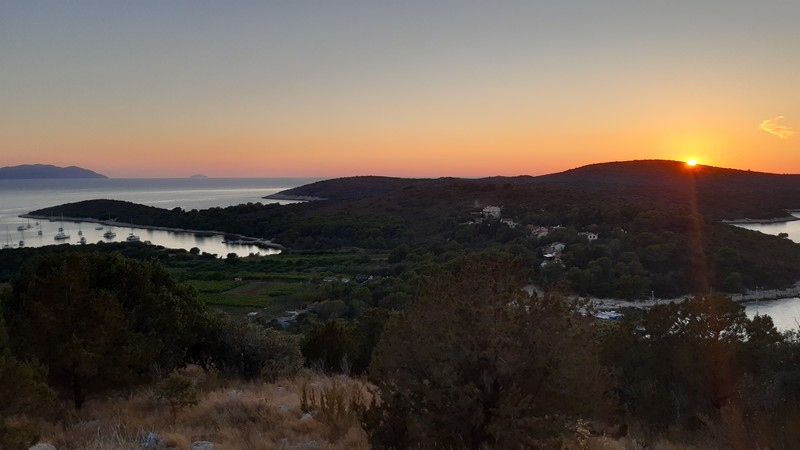 Je fais un peu de hors sentier afin de grimper au sommet de l’île, offrant un panorama époustouflant sur l’ensemble de l’archipel. Fidèle à mes habitudes, je flâne et manque de me perdre au moment du coucher du soleil. Je ne sais pas encore qu’en Croatie, le soleil se couche une heure avant l’heure française. Et pour changer, j’ai oublié de prendre ma lampe torche ! J’aime jouer à me faire peur (sans grand risque toutefois).
