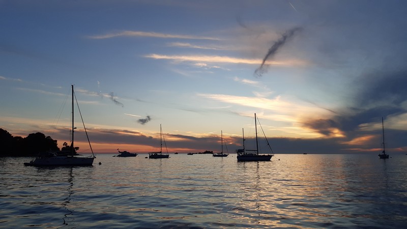 Après avoir passé deux jours à Pula pour cause de pluie et d’orage, nous partons de bon matin pour une courte navigation au moteur. La côte d’Istrie est magnifique, l’arrière-pays aux villages perchés rappelle la Toscane, les îles sont très boisées. Cela me donne envie de revenir plus tard faire un road-trip dans la région !