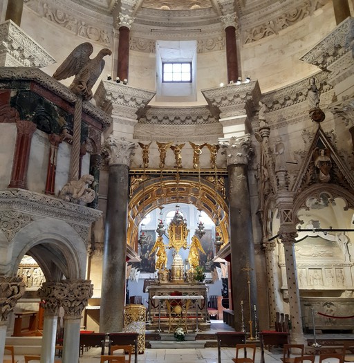 Il y a peu de touristes dans les rues, en cette période très particulière. Plutôt que de faire le tour des murailles, itinéraire conseillé par tous les guides touristiques et donc très fréquenté (et cher !), je prends le temps de déambuler au hasard sans me fixer d’objectifs de visite. Les églises de la ville sont d’architecture baroque romaine, mais de décoration vénitienne. La cathédrale de Dubrovnik abrite une belle Assomption de Titien que je contemple longuement.