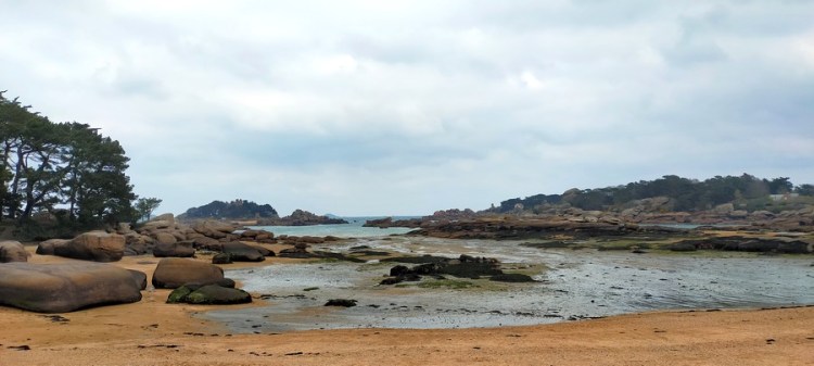 Après avoir dépassé le port de Ploumanac’h et ses anciens moulins à mer (qui utilisent l’énergie marémotrice), nous atteignons la baie de Sainte-Anne qui borde Trégastel. Pas un commerce, pas une âme qui vive : ce lieu touristique est très silencieux en cette fin d’hiver !