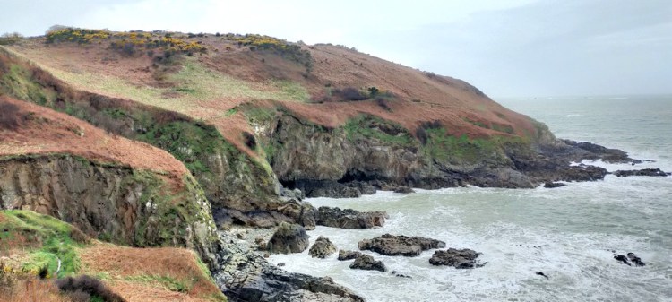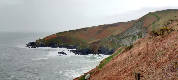 Entre Beg ar Fry et Beg Gracia, sur une durée approximative de trois heures de marche, nous essuyons une giboulée et quatre averses, accompagnées de rafales à 100 km/h et d’un vent horizontal venu de la mer. L’une des rafales détruit d’un seul coup mon parapluie de randonnée. Nos vêtements sont trempés, mais le plus gênant est que le sentier le soit tout autant : nous pataugeons dans la boue et progressons très lentement, manquant de glisser à chaque pas !