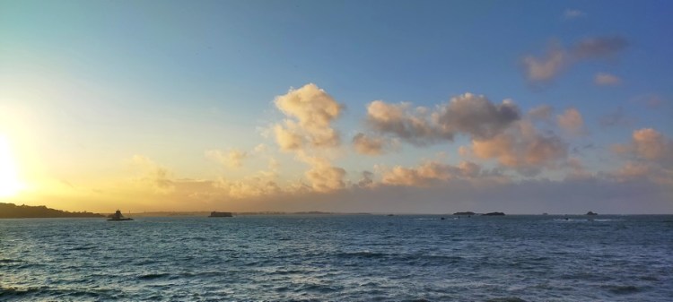 Pour conclure cette superbe étape, nous assistons au coucher de soleil depuis la pointe de Barnénez. De là, nous pouvons apercevoir le chapelet d’îles de la baie de Morlaix, dont le château du Taureau. Un avant-goût de notre prochaine section de GR34 !
