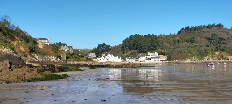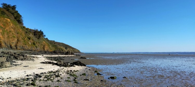 Nous atteignons la mer et nous nous heurtons au premier contournement du sentier pour cause d’éboulement (une tempête ayant causé des dégâts sur tout le littoral breton au mois de janvier 2021). Nous décidons donc de couper par la plage, profitant de ce que la mer est à marée basse. Nous suivons les gens du coin qui font de la pêche à pied. Sauf qu’eux ont des bottes… Nous nous retrouvons à patauger dans les ruisseaux laissés par la mer sur le sable. Merci à nos chaussures en Goretex qui nous tiennent au sec !