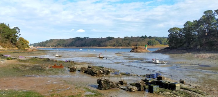 Arrivés au Port Lazo, la mer est suffisamment basse pour que nous puissions couper à travers la baie de Paimpol. Nous traversons un immense parc ostréicole. À marée basse, j’aime regarder s’activer les ouvriers et les tracteurs ; à marée haute, tout est recouvert. Quand la mer se retire, la baie de Paimpol est magique !