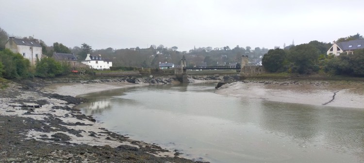 La seconde partie de l’étape, à savoir l’estuaire du Jaudy, n’a pas grand intérêt selon moi. Il s’agit d’une campagne assez pauvre, cela se voit à l’habitat et au peu de bâti en pierre. Toutefois (et cela est suffisamment rare pour être noté), les villes sauvent la mise : les maisons à colombages et la fière cathédrale de Tréguier, ancienne capitale du Trégor, rompent la monotonie des sentiers boueux, et la belle passerelle Saint-François égaye notre arrivée à Plouguiel.