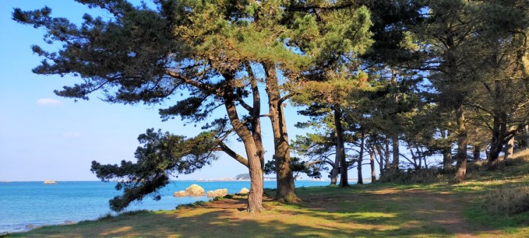 De retour sur la terre ferme, nous retrouvons avec soulagement le calme du sentier. Nous achevons l’étape par une très agréable section forestière avec vue sur d’innombrables îlots. La lumière du couchant rend la baie de Loguivy très vaporeuse, nimbée de mystère. La mer revêt des teintes d’aquarelle (que les photos ne savent pas rendre) : une superposition de bleu-gris, de turquoise et de beige.