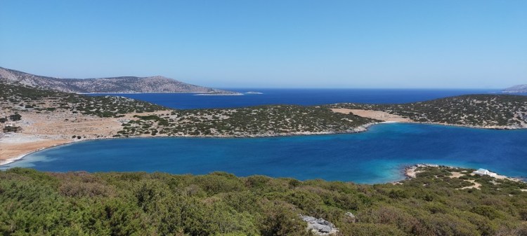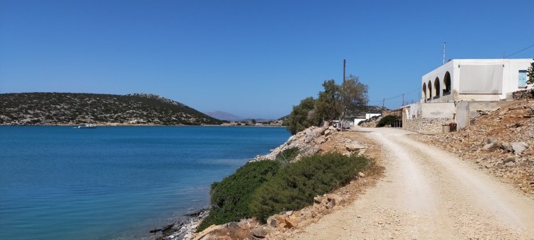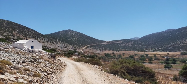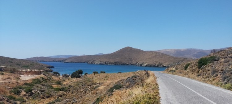 Je contourne tout d’abord l’anse de Porto Vathy par une route non goudronnée, la seule de cette partie de l’île. Au bout de deux kilomètres, je rejoins une route goudronnée peu fréquentée. Malgré la chaleur, la marche est très agréable : la route monte en lacets amples, dévoilant depuis les hauteurs de nombreuses criques, langues de sable et collines dégarnies, parsemées d’églises aux murs blancs et aux coupoles bleues.