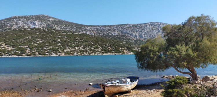 Je découvre une petite crique à l’ombre de quelques oliviers, fait rare sur cette île où il n’y a presque pas d’arbres. Je m’installe sous un olivier pour profiter de sa fraîcheur. Un véritable paysage de carte postale, avec comme seule compagnie un petit bateau à moteur sur lequel pêchent un père et sa fille, et non loin de moi, une naturiste qui fait du snorkeling.
