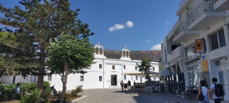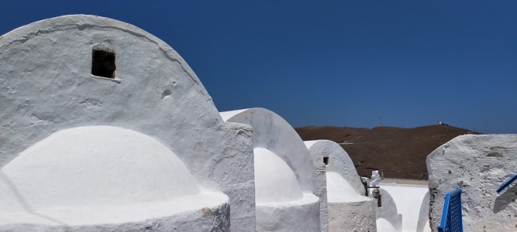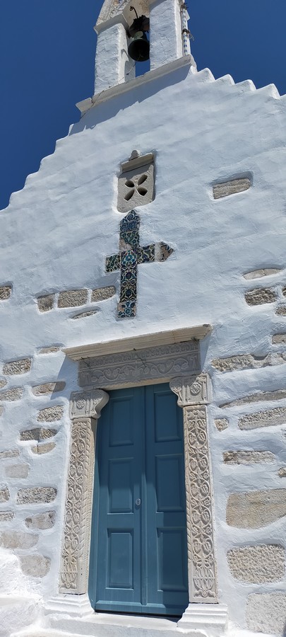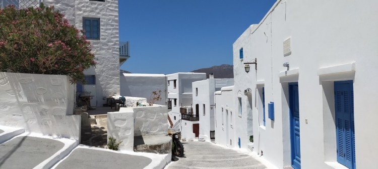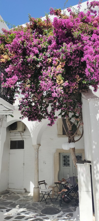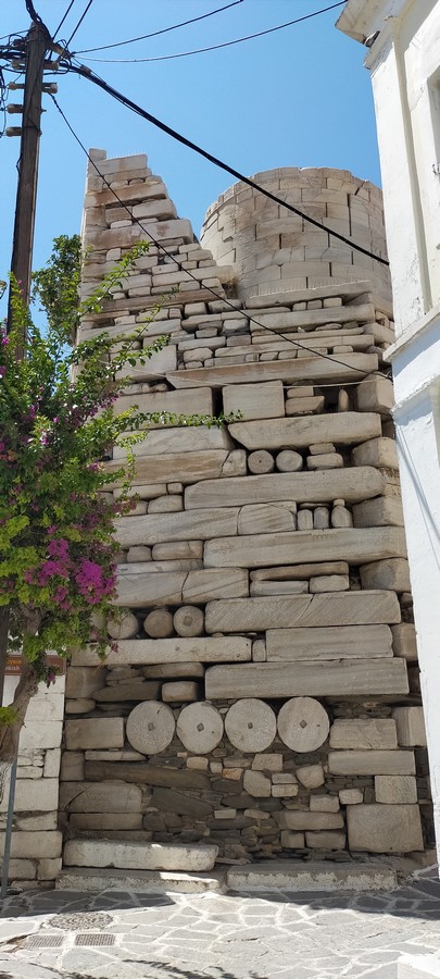 Après-midi à terre : une belle terrasse où nous prenons un verre, un village blanc étagé, typique des Cyclades, un mur franc avec remploi de colonnes antiques…