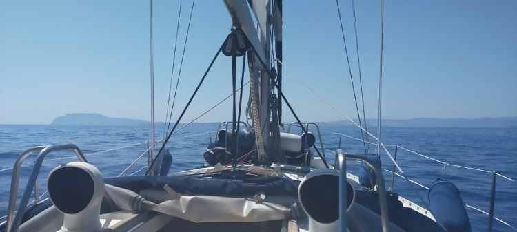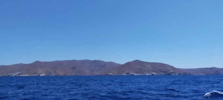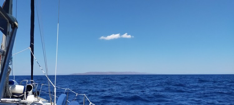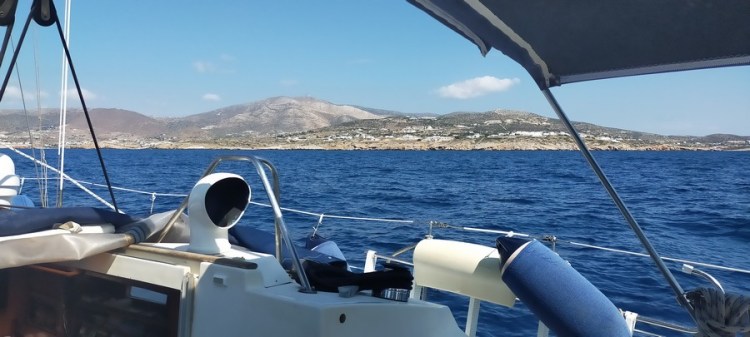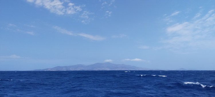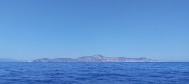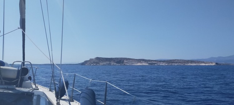 Départ à 8h30. Le meltem nous poursuit jusque dans les Cyclades ! Nous naviguons face au vent, au moteur avec la grand voile pour stabiliser le bateau. Heureusement la mer n’est pas aussi dure qu’entre Leros et Astypalea, ce qui nous permet d’avancer à un rythme correct.