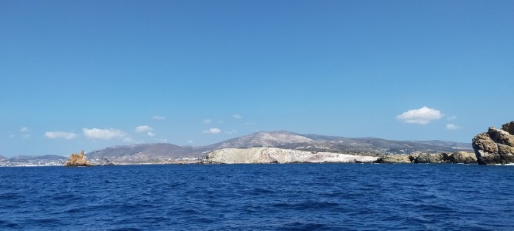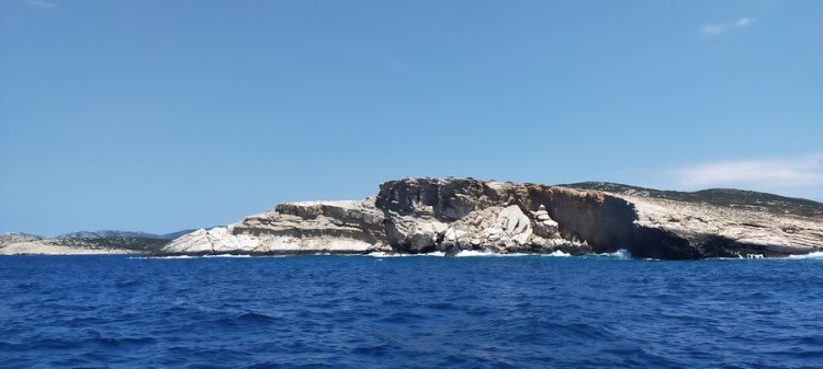 Troisième séquence : le vent tombe, nous remontons Antiparos au moteur jusqu’au port de Parikia, la capitale de l’île de Paros. Le défilé de falaises de l’île d’Antiparos est superbe.