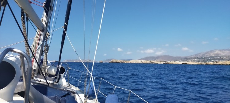 Première séquence : pas de vent mais houle dans le chenal entre les îles. Sortie des petites Cyclades au moteur avec la grand voile pour stabiliser le bateau, ce qui nous évite de trop taper dans la vague.