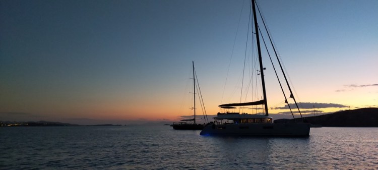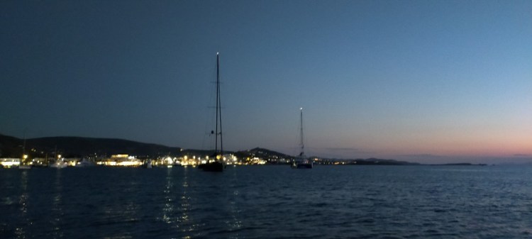 Après notre troisième et dernier dîner à la taverne de Maria, nous retournons au bateau et refaisons le monde au crépuscule.