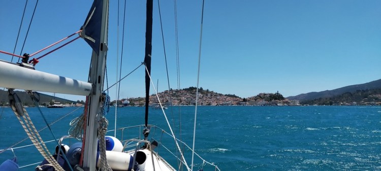Ce matin, pour notre dernière journée de navigation, nous espérons naviguer à la voile avec 15 nœuds de vent. Ce sera finalement une navigation au moteur avec 20-25 nœuds de vent orienté différemment des prévisions météo. Meltem, tu nous auras fait tourner en bourrique jusqu’au bout !