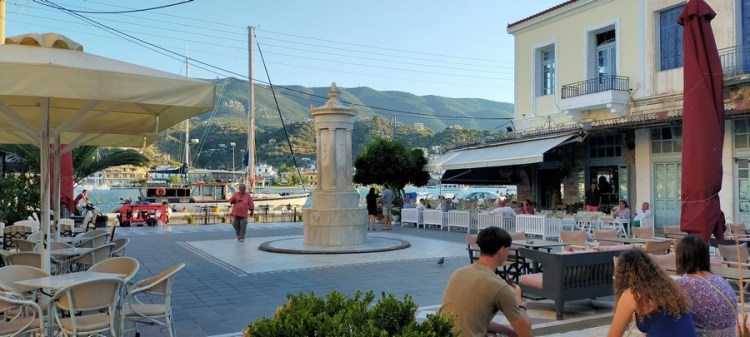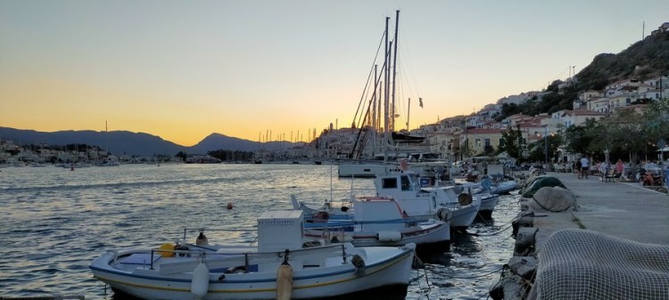 Nous visitons Poros la belle du golfe Saronique, dînons dans une excellente taverne (comme à chaque fois !) et parcourons au soleil couchant la promenade du port de Poros.