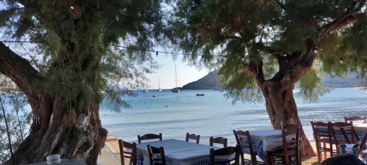 En face du bateau, une petite église blanche à toit bleu. Nous sommes prises d’un fou rire en apercevant Vincent assis sur un banc à côté de deux vieux Grecs, totalement intégré au paysage, comme si de rien n’était ! Puis nous dînons gaiement dans une délicieuse taverne de plage.