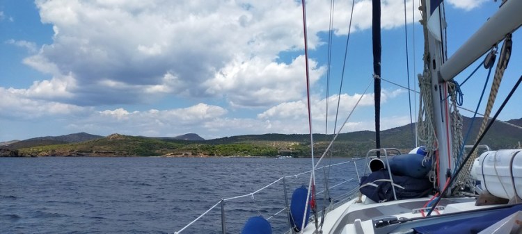 Aujourd’hui, il est annoncé un vent soutenu mais navigable. Nous larguons les amarres à 9 heures du matin et sortons tranquillement (à la voile tout de même !) de l’anse de Lakki, la « capitale » de Leros.