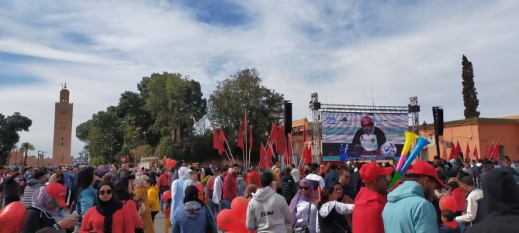 En arrivant sur la place Jemma el-Fna, j’apprends par Wilmer, mon ami vénézuélien, que le huitième de finale de la coupe du monde de football 2022 Maroc–Espagne aura lieu cet après-midi. J’aurais de toute façon fini par l’apprendre : difficile de ne pas s’en apercevoir. Écran géant, vuvuzelas, youyous, drapeaux et maillots, ici c’est la fête avant l’heure !