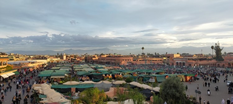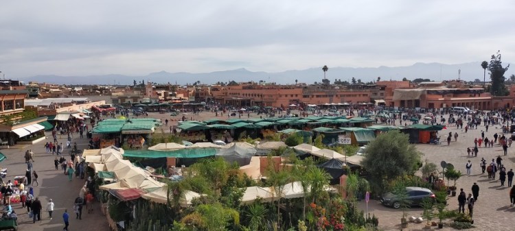 Mes premières impressions sont excellentes : à l’aéroport, tout le monde est gentil, serviable et parle français. Je prends la navette pour l’immense place centrale de la Médina (zone de la ville qui se trouve à l’intérieur des remparts), qui se nomme place Jemma el-Fna.
