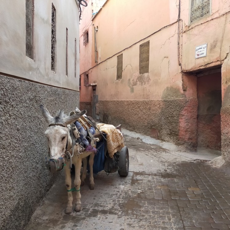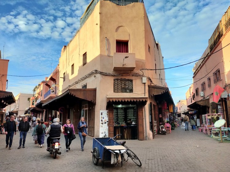 - L’unique danger réel vient de la circulation routière. La Médina de Marrakech est une jungle de scooters, vélos, voitures, tuk-tuks, chariots tirés par des ânes ou des chevaux… dans des rues pavées, non goudronnées, très étroites et sans trottoir. L’étranger doit rapidement apprendre à se mouvoir, à être à l’affût et à s’écarter lorsque le moindre indice lui fait sentir le surgissement d’un véhicule derrière lui. En théorie, il suffit de raser les murs dès qu’on entend un klaxon ou la vibration du pot d’échappement d’un scooter.