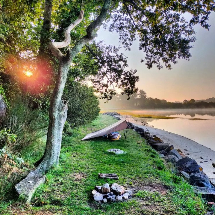 Je trouve un emplacement idéal pour mon premier bivouac en baie de Lanveur, mais une famille y est déjà en train de faire un feu de camp… Vont-ils aussi camper ici cette nuit ? Non, ils sont juste là pour le dîner et le coucher de soleil. Je leur demande si je peux installer mon tarp à côté d’eux, pas de problème. Vers 23 heures, ils partent en laissant le feu allumé, pensant sans doute me rendre service. Mais cela ne m’arrange guère : un feu rend le bivouac repérable et peu discret. Je ne me sens pas tranquille ! Je sors donc de mon demi-sommeil, éteins le feu et retourne me coucher.