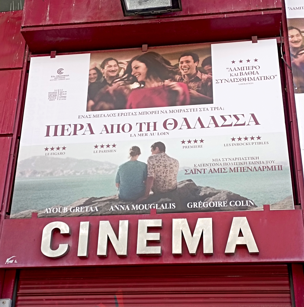 Au hasard de mes balades, je tombe sur un vieux cinéma du centre d’Athènes qui projette le film produit par mon amie Sophie, La Mer au loin. Très beau film que j’ai eu la chance de voir en avant-première à la Cinémathèque de Paris aux côtés de l’équipe de tournage, l’année précédente, et que je recommande vivement ! Que le monde est petit…