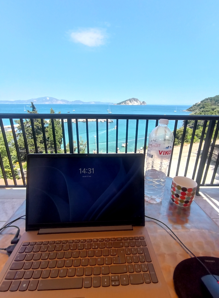 Sous prétexte de rendre visite à mon copain Sakis, natif de Zakynthos, je reste une dizaine de jours à travailler et à écrire sur mon balcon, face à une plage très (très !) retirée du sud de l’île, dans le (tout) petit village de Keri. Zéro vie sociale, l’un des séjours les plus tranquilles de mon quotidien nomade. Par moments, c’est ce dont j’ai besoin. Le plein et le vide. Seule avec mes livres et la mer.
